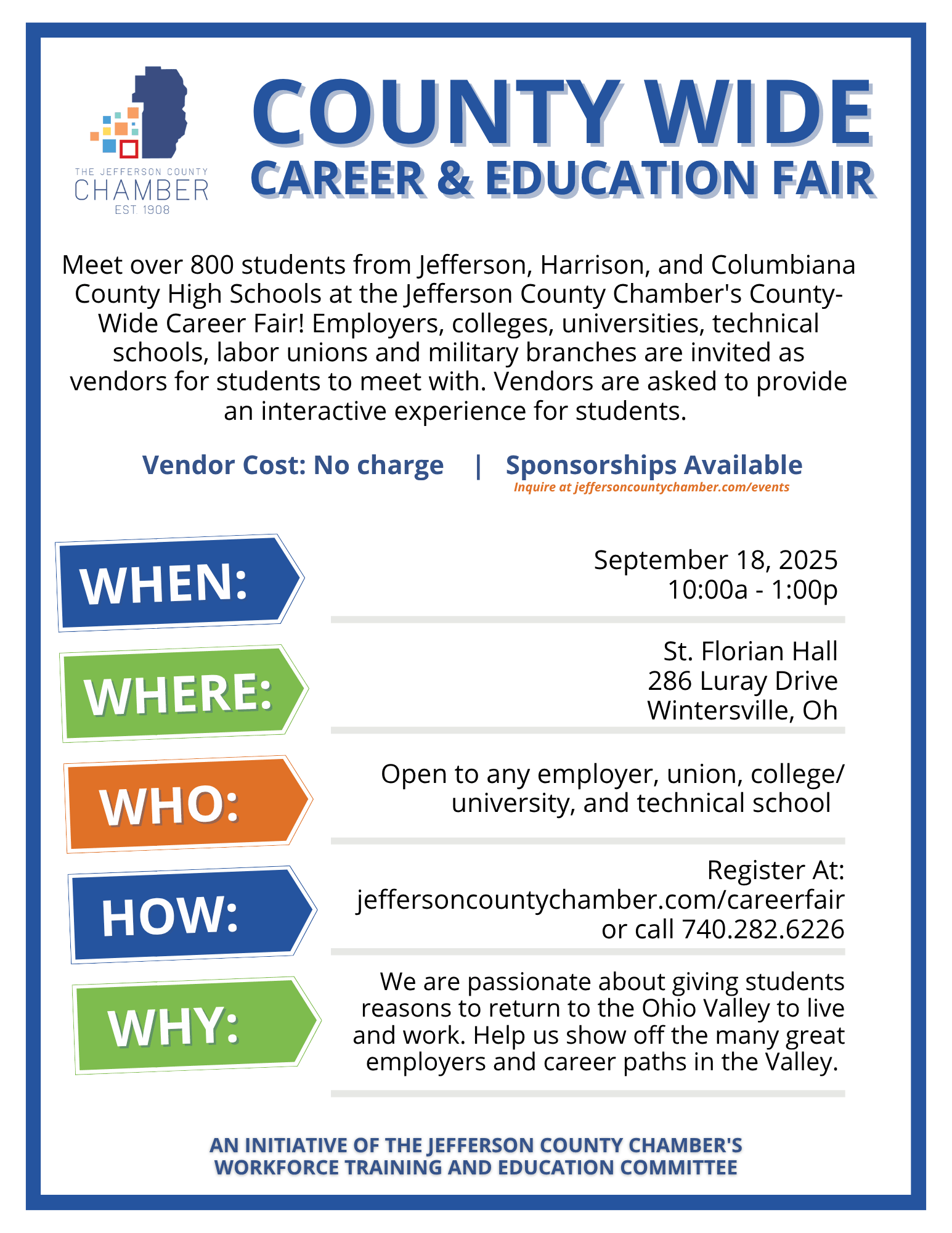 Meet over 800 students from Jefferson, Harrison, and Columbiana County High Schools at the Jefferson County Chamber's County-Wide Career Fair! Employers, colleges, universities, technical schools, labor unions and military branches are invited as vendors for students to meet with.